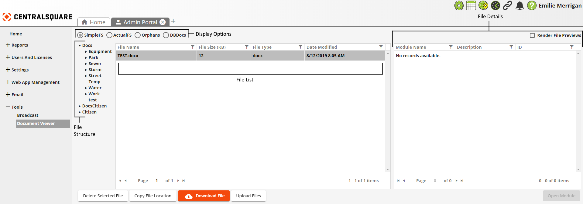 Displays the files stored in the directory selected in the File Structure. Appearance and available documents are dictated by selected Display Options at top of page. |