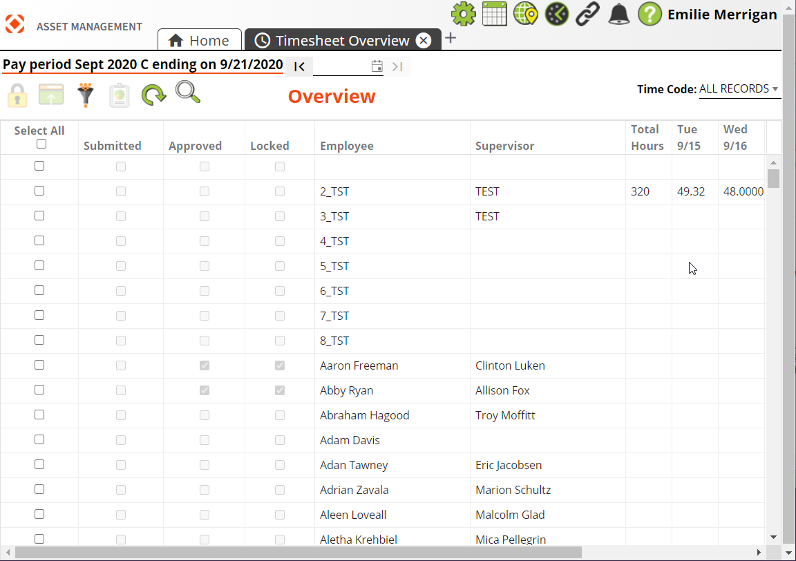 - Check the checkbox next to each record that you would like to Approve or Lock. Check the Select All checkbox at the top of the column to select all employee records in the current view.