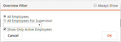All Employees for Supervisor - Limits the overview to employees who report to the Supervisor selected in the drop-down box. Note: When this option is selected, the system automatically selects the Supervisor who is currently loggedAll Employees in (if the user is a supervisor).