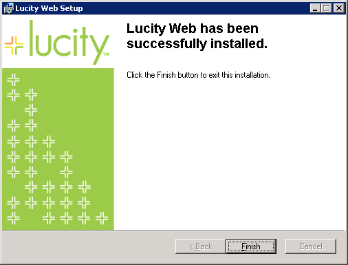 Note: Now that the installation has successfully completed, additional setup will be required to fully utilize the Web application. Please refer to the Lucity Administration for Web apps help guide, "Getting Started" topic to complete this setup. This help guide is part of the Desktop Installation and can be found where the Lucity applications have been installed.