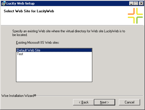 to continue. The Existing Site dialog will appear:Note: This screen will appear only if more than one site is defined in IIS. If there is only one web site, this screen will not appear.