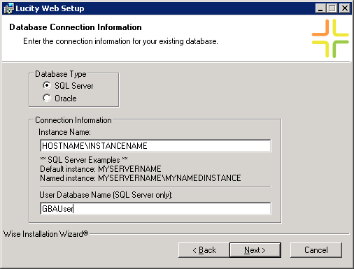 Note: Depending on which database you are using (Oracle or SQL Server), select the appropriate radio button. Then, enter the appropriate DB connection information based on your database type. Note that these need to be existing databases as the installation will not be creating databases for you.