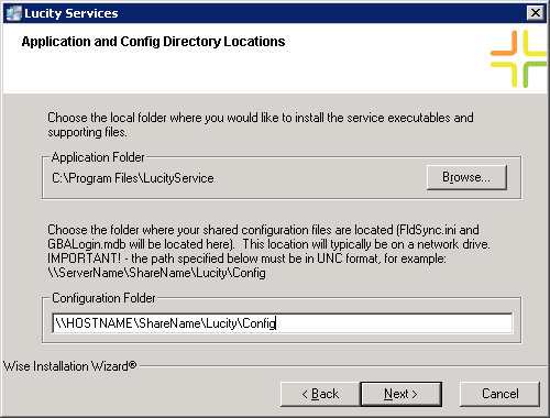 Note: UNC naming must be used to specify the shared configuration directory, as Windows services do not have access to mapped drives. See the screen above for an example of UNC formatting.