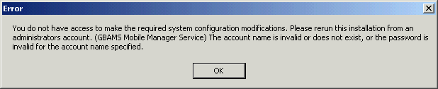 to continue. The Services installation process will begin.Note: If you receive the following error during the installation, there is likely a problem with the credentials you specified earlier in the install. Please rerun the installation and provide credentials that have local administrative privileges. These credentials must also have read/write/execute access to the application and configuration directories you specified.