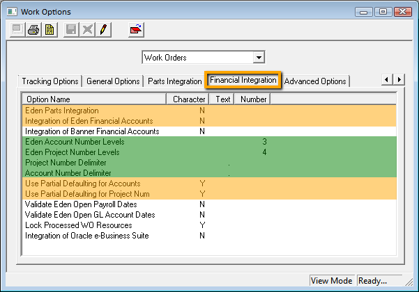 Open Work > Administration > Work Options > Financial Integration tab from the desktop main menu.