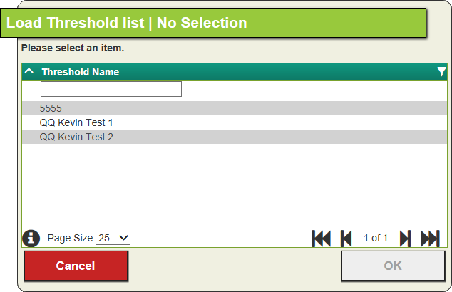 The Threshold Library module is used to establish the limits or parameters that the results of an equipment test should fall within. These libraries can be loaded directly into an Equipment Inspection. The module consists of a Threshold Name field and a grid listing the group of thresholds.