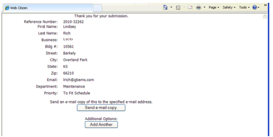 The Request Thank You page appears after a work request is submitted into the citizen portal. It provides an overview of the request, the opportunity to email a copy of the request, and to add another request.