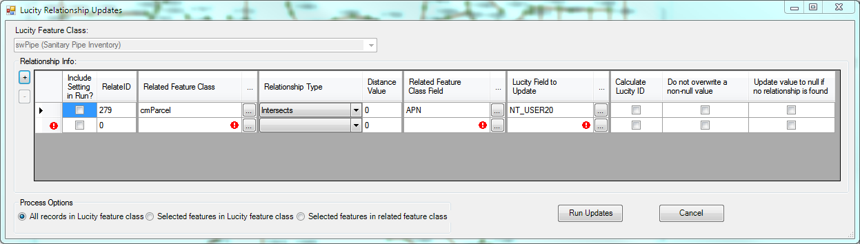 Runs the tool against the selected records from the Related Feature Class, identifies the Lucity records that meet the Relationship Type, then updates only those Lucity records. |