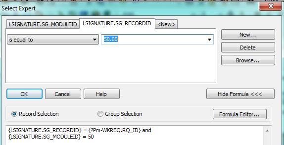 Within the subreport's Select Expert dialog, the specific Signature Type (SG_NAME) needs to be referenced.